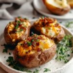 For a fun twist, turn these baked potatoes into loaded “potato skins” by scooping out some of the interior, mixing it with cheese and toppings, then returning the filling for an extra melty, crispy treat. Or serve them halved on a colorful platter garnished with herbs for a casual yet polished look.