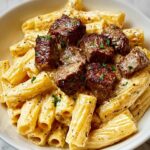 This Cajun Steak Tips in Cheesy Rigatoni Parmesan Sauce is a flavorful and indulgent pasta dish combining tender, spiced steak tips with a rich and creamy Parmesan sauce. Perfect for a comforting weeknight dinner, this recipe offers a delightful balance of bold Cajun seasoning and smooth cheesy textures paired with perfectly cooked rigatoni pasta.