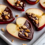 - Add final touch and chill: Optionally, sprinkle a pinch of flaky sea salt over each slice to enhance flavor. Place the baking sheet in the refrigerator and chill the apple slices for 15–20 minutes, or until the chocolate sets and toppings are firm.
