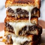 - Assemble Sandwiches: Spread the butter-mayonnaise mixture on one side of each slice of sourdough bread. On half of the slices, layer one slice of Swiss cheese, one cooked beef patty, and approximately ⅜ cup of caramelized onions. Then top each with another slice of Swiss cheese and cover with the remaining bread slices, buttered side out.