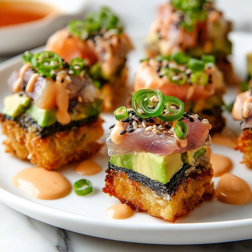 Pressing the sushi rice firmly into molds and using a skillet to warm the rice cups after chilling helps develop a crispy bottom layer. This contrast between crunchy rice and soft toppings is the hallmark of this dish.