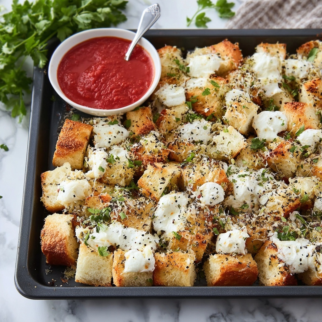 Lay out the garlic bread cubes evenly on a sheet pan so each piece can toast just right. Next, sprinkle the shredded mozzarella and grated parmesan evenly across the cubes, making sure every bite will be cheesy and flavorful.
