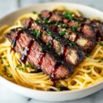 4. Combine noodles and steak: Toss the cooked noodles into the garlic butter sauce in the skillet. Return the seared steak slices to the pan and toss everything together until the noodles and steak are evenly coated and heated through, about 1 minute.