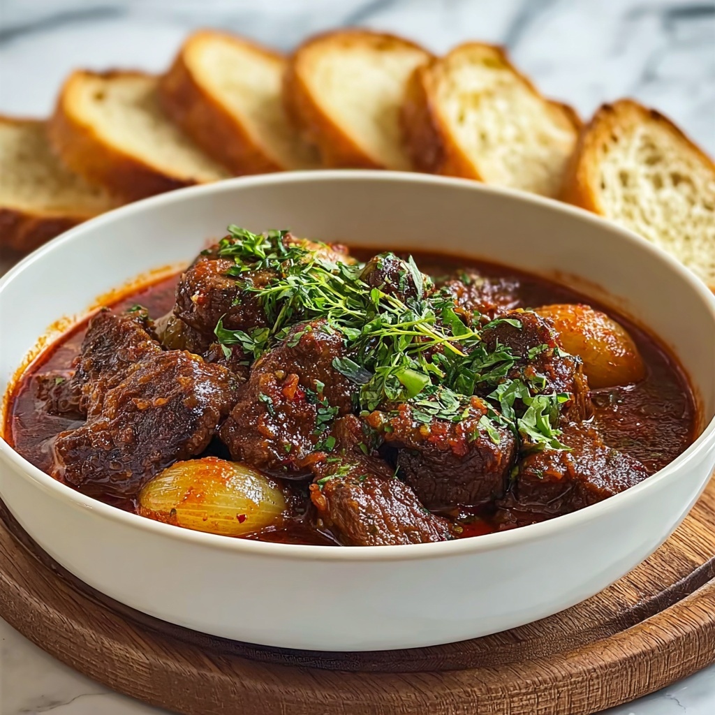 A traditional Greek beef stew known as Stifado, featuring tender beef chuck and sweet shallots slowly braised in a flavorful tomato, wine, and aromatic spice sauce. This comforting and rich main course captures the essence of Mediterranean cuisine and is perfect served with crusty bread, rice, or orzo.