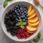 A refreshing and vibrant Honey Lime Basil Peach Fruit Salad featuring ripe peaches, fresh berries, and grapes tossed in a sweet and tangy honey-lime dressing with aromatic basil. Perfect as a healthy summer side or snack.