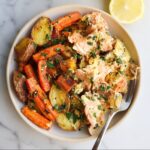 To reheat, gently warm your leftovers in the oven at 350 degrees Fahrenheit for 10-15 minutes to help preserve the textures. Avoid microwaving if possible, as the salmon can dry out and the potatoes and carrots might lose their crispness.