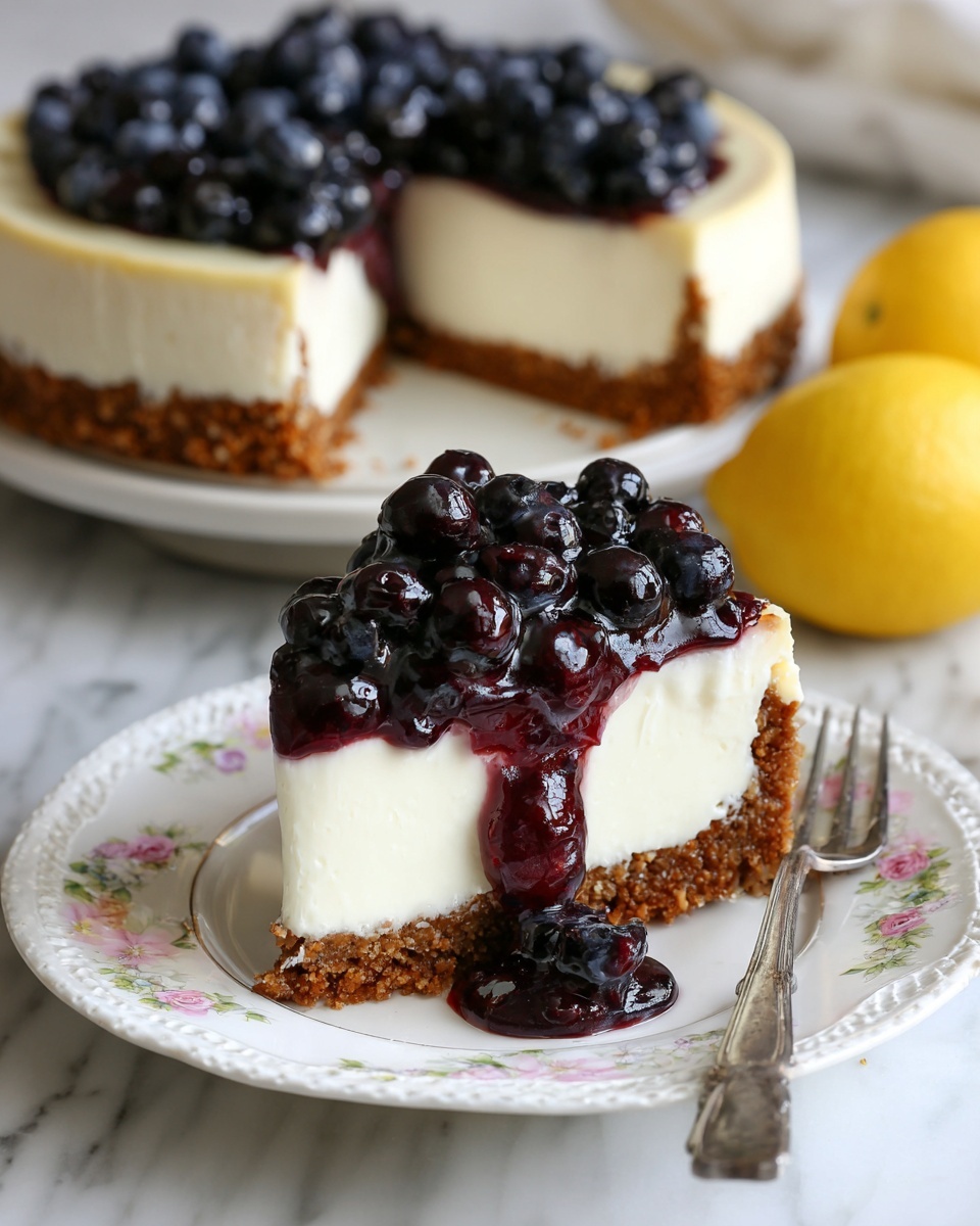 Enhance the visual appeal and flavor of your Lemon Blueberry Cheesecake Recipe by adding a few fresh blueberries on top along with some thin lemon slices or zests. A light dusting of powdered sugar also adds a lovely, delicate sweetness and festive look that makes each slice feel like a special treat.