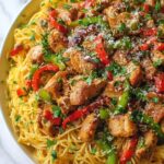 Return the cooked chicken to the skillet, then add the drained pasta. Give everything a good toss so the sauce thoroughly coats each strand of pasta and piece of chicken, ensuring every forkful is richly flavorful.