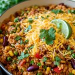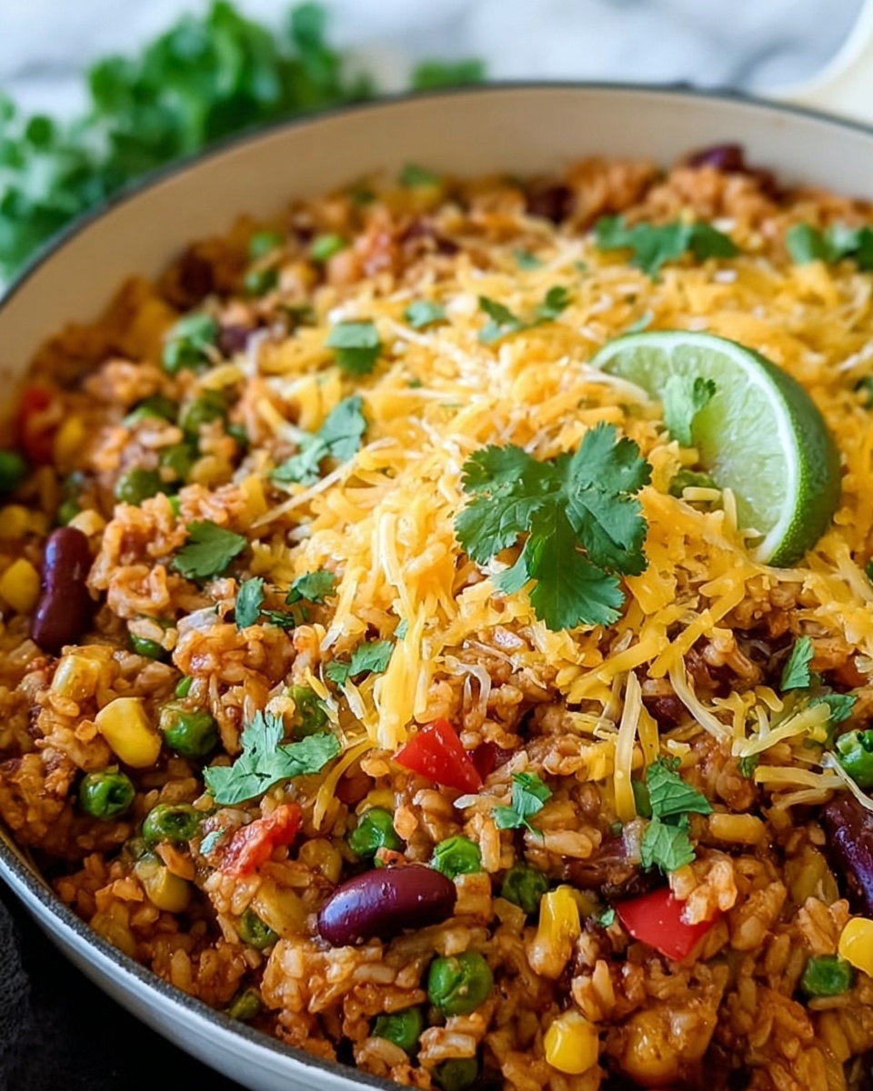 This vibrant Mexican Rice Skillet is a flavorful one-pan meal featuring long-grain white rice cooked with aromatic spices, diced tomatoes, corn, black beans, and topped with melted cheese and fresh cilantro. Perfect for a quick and satisfying weeknight dinner, it brings a delicious blend of textures and smoky, zesty flavors in every bite.