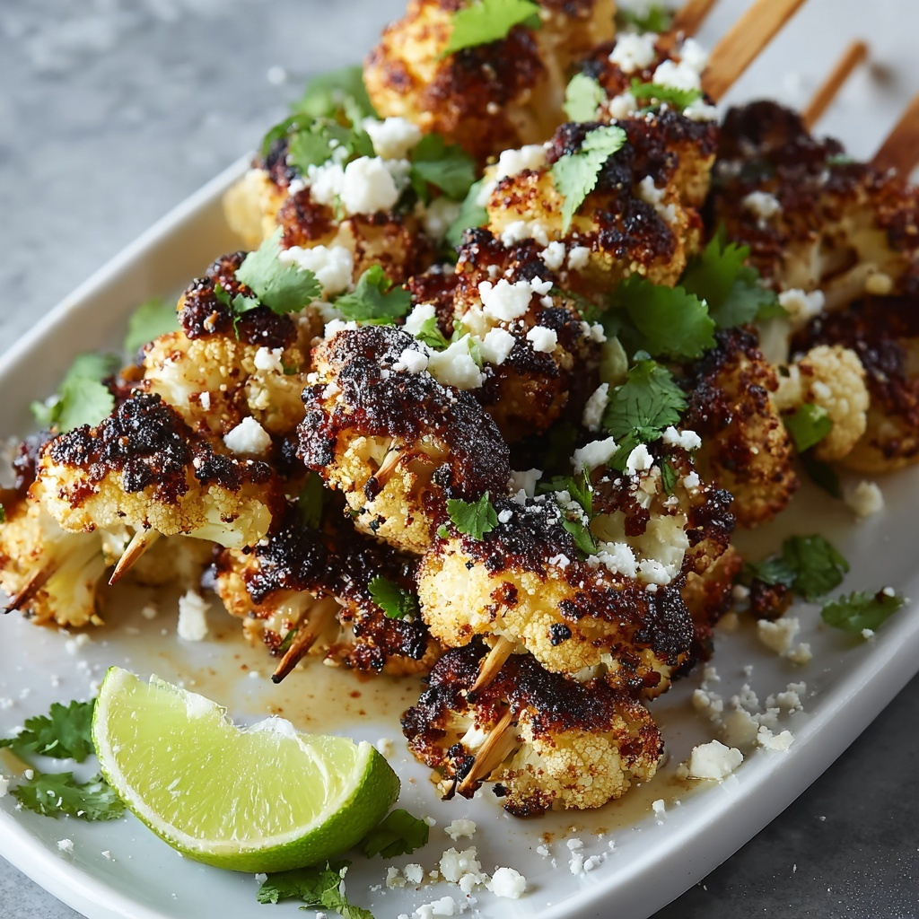 A flavorful Mexican street-style grilled cauliflower recipe featuring tender charred florets seasoned with chili and garlic spices, topped with a zesty creamy sauce and crumbled Cotija cheese for an irresistible vegetarian appetizer or side dish.