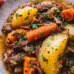 Cover the pot and either roast in your preheated oven for 3 to 4 hours or slow cook on low for 6 to 8 hours. You’ll know it’s ready when the meat is tender and falling apart effortlessly, the vegetables are soft, and all the flavors have melded beautifully.