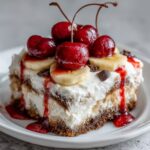 This No-Bake Banana Split Cheesecake is a delicious and refreshing dessert that combines the classic flavors of a banana split with creamy cheesecake layers. It’s easy to prepare without any baking, featuring a graham cracker crust, creamy cream cheese filling, fresh bananas, pineapple, strawberries, and a drizzle of chocolate syrup topped with chopped peanuts and maraschino cherries. Perfect for summer or any occasion where you want a fruity, creamy treat.