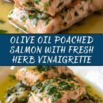 - Finish and serve: Once the salmon is poached, carefully remove the fillets from the olive oil and drain briefly on paper towels. Serve the salmon warm or at room temperature, spooning the herb vinaigrette generously over the top.