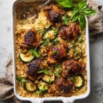 - Arrange Chicken: Place the marinated chicken pieces evenly over the rice and zucchini in the baking dish, ensuring they’re spaced for even cooking.