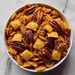 Praline Crunch is a sweet, crunchy cereal treat combining Crispix cereal with pecan halves coated in a rich, buttery praline glaze. Baked to perfection and cooled for a delightful snack or dessert that’s perfect for sharing.