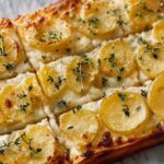 This Puff Pastry Potato Tart is a delightful French-inspired appetizer featuring thinly sliced Yukon Gold potatoes layered over a flaky puff pastry crust. Enhanced with fresh thyme, cheese, and a golden egg wash border, it’s perfect for a savory snack or elegant starter.
