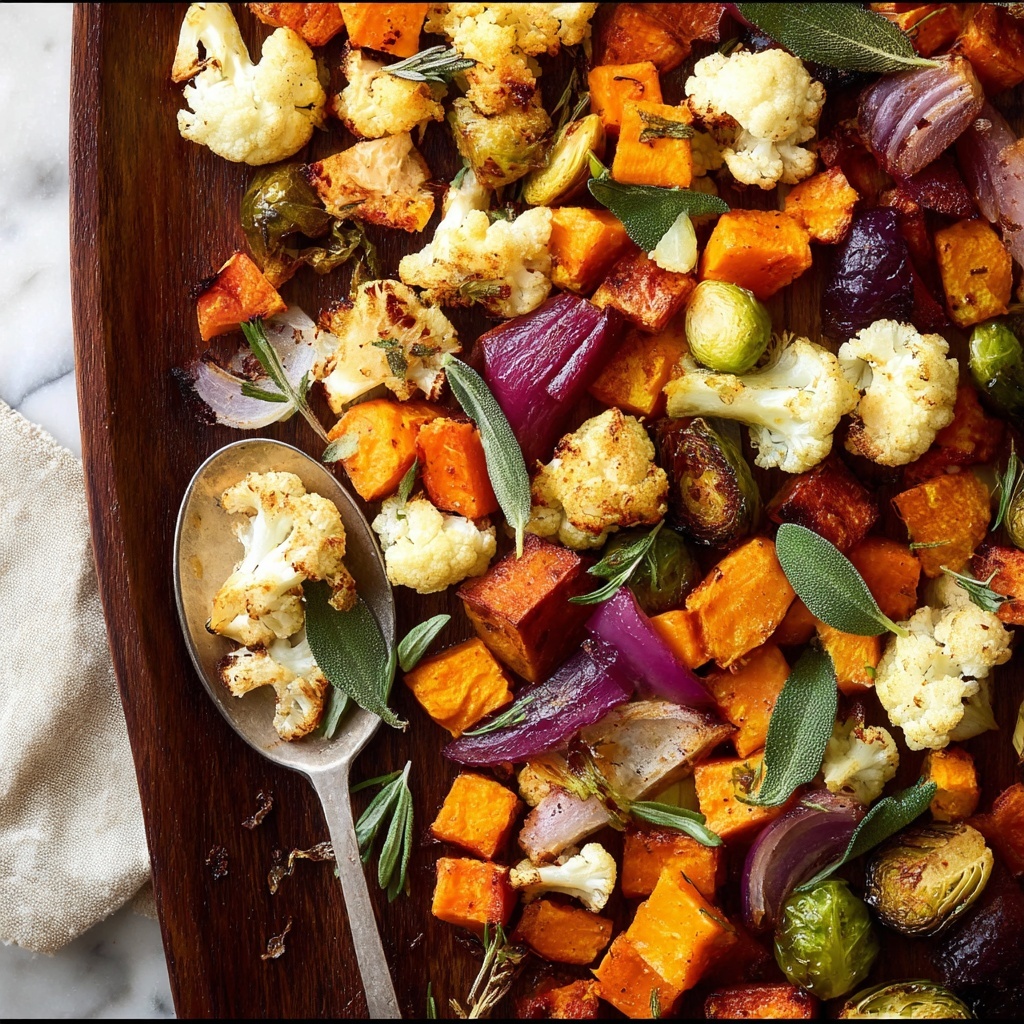 This vibrant roasted vegetables recipe features a medley of seasonal root and cruciferous vegetables like butternut squash, Brussels sprouts, cauliflower, carrots, turnips, red onion, and radishes, perfectly caramelized in the oven with a drizzle of olive oil, fresh herbs, and optional apple cider vinegar dressing. Ideal as a flavorful side dish, these roasted vegetables offer a simple, healthy way to bring out natural sweetness and savory depth, with customizable options to suit your taste.