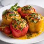 Romanian Stuffed Peppers, known as Ardei Umpluți, are a hearty traditional dish featuring bell peppers filled with a savory mixture of ground pork, rice, and aromatic spices. Slow-simmered in a tangy tomato sauce, these peppers are tender, flavorful, and perfect as a comforting main course, garnished with fresh parsley and optionally served with sour cream and crusty bread.