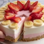 - Decorate and Serve: Before serving, top the chilled cheesecake with whipped cream, fresh strawberry slices, and banana slices. Slice carefully and enjoy every creamy and fruity bite!
