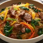 Japchae is a classic Korean dish featuring sweet potato glass noodles stir-fried with tender beef and sautéed vegetables in a savory-sweet soy and sesame oil sauce. This colorful and flavorful dish combines the chewiness of noodles with the freshness of spinach, carrots, and onions, perfect as a main or side dish.