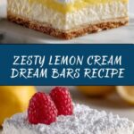 Zesty Lemon Cream Dream Bars are a luscious dessert featuring a buttery graham cracker crust topped with a creamy lemon-infused cheesecake filling swirled with raspberry preserves. These bars are chilled to perfection and garnished with fresh raspberries, lemon slices, and whipped cream, offering a refreshing balance of tangy and sweet flavors in every bite.